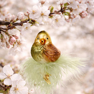 Filigraner Glasvogel von Inge Glas mit praktischer Befestigungsklammer. Das Ornament ist in sanften Gelb-, Grün- und Brauntönen gehalten und bringt eine lebendige, frühlingshafte Note an den Osterbaum.